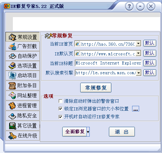 開山IE修復專家對IE修復分為常規(guī)修復和全面修復,并且開山IE修復專家還有廣告攔截。啟動項管理、網址整理和進程管理等功能。