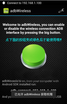 1、打開手機端的“adbWireless”軟件,點中間的灰色按鈕,當變成綠色后說明程序啟動成功;
