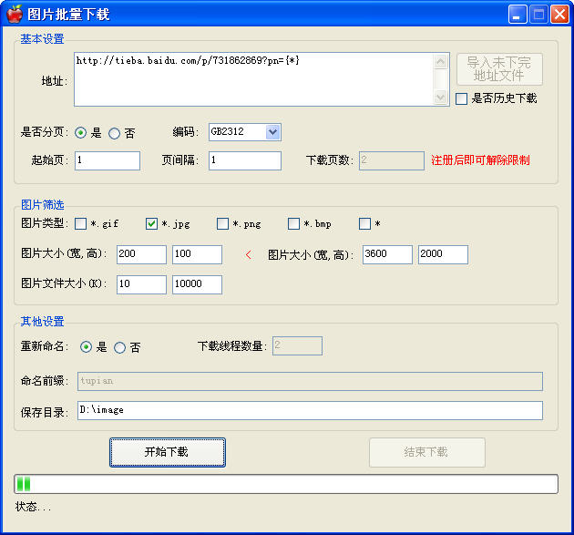 本軟件可以輕松幫你實現(xiàn),只要把你想的圖片的網(wǎng)址寫在基本設(shè)置的地址欄,下面就是設(shè)置你圖大的規(guī)格什么的,然后點開始下載就會把這個網(wǎng)址內(nèi)所有圖片都下載到你的電腦上。