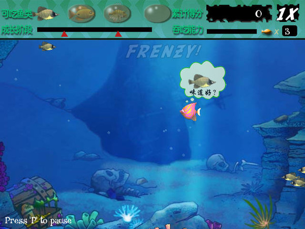 大魚吃小魚是一款經(jīng)典的休閑游戲,簡(jiǎn)單的操作更是深入人心。大魚吃小魚游戲的主角是一條很小的熱帶魚,游戲的方式是讓主角先吃下與自已體型相同的魚,等吃下一定的數(shù)量且主角的體型變大后,就能再吃下其它體型更大的魚類,而且只要讓CROWTH 的值填滿,就能進(jìn)入到下一關(guān)。