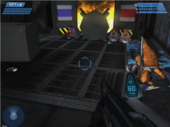 回到方才錐形大廳的二層平臺(tái),用開(kāi)關(guān)接通橋梁到對(duì)面(也可繞過(guò)去),可看到墻上畫(huà)有兩個(gè)圓形的圖符,進(jìn)入大門(mén)往左側(cè)看到地上有一灘血跡,在戰(zhàn)友尸體旁有兩個(gè)藥包,沿斜坡走下去找到一扇大門(mén),觸發(fā)的動(dòng)畫(huà)中主角在屋里找到一只頭盔,根據(jù)上面的視頻錄像顯示,隊(duì)友曾在這里遭遇蜂擁而至的爬蟲(chóng)怪物(Flood),看完錄像后走到正中的平臺(tái)準(zhǔn)備作戰(zhàn),怪物會(huì)陸續(xù)從四道門(mén)里涌出來(lái),注意觀察屏幕左下角的雷達(dá)顯示,在怪物近身之前迅速掃射清除,其實(shí)它們的防御和生命很差,只是速度快得驚人。將四道門(mén)中的小怪物清除后,由進(jìn)來(lái)的門(mén)會(huì)跳出幾只巨形的變異怪物,且戰(zhàn)且退將之殺掉,確認(rèn)將所有的怪物殺光后會(huì)得到新的任務(wù)指示。