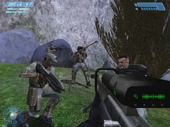 如果你還記得2002年初發(fā)行的那款《命令與征服:叛逆者》,那么你一定還對(duì)主角身上的能量護(hù)盾記憶猶新。HALO也有類似的設(shè)計(jì),在游戲里,敵人必須先將你身上的能量護(hù)盾全部打掉才能傷害到你。這個(gè)設(shè)計(jì)讓血的多少不再成為決定生死的唯一條件,只要你能運(yùn)氣好到L型的能量護(hù)盾一直不消失,那么你就可以創(chuàng)造零血過(guò)關(guān)的奇跡之戰(zhàn)。