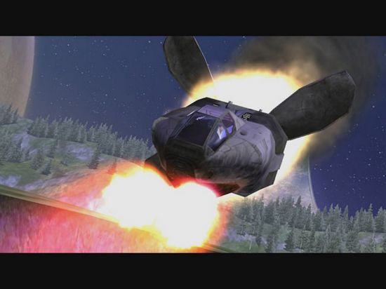 A路線:步出隧道后迅速往前沖,在山梁上停放著一架女妖飛行船(Banshee),這時(shí)會(huì)出現(xiàn)一只怪物朝它跑過(guò)去,要趕在它之前跳上飛船,如果失敗可讀進(jìn)度再試,駕駛著飛船熟悉一下操作,利用電光炮清除山道上的敵軍,降到山谷的底部消滅幾輛幽靈戰(zhàn)車,最后飛到錐形建筑的頂部平臺(tái),炸毀上面的槍塔和敵人后著陸。