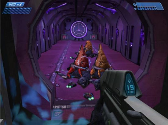 離開(kāi)控制室在走廊遇到怪物和飛行機(jī)器人的混戰(zhàn),不用理會(huì)它們,跑到盡頭用機(jī)關(guān)開(kāi)門(mén),地上的兩只光盾可藏身應(yīng)付沖出來(lái)的敵人。穿出兩道門(mén)后,眼前即是第五關(guān)后期的峽谷,主角目前位于錐形建筑物的頂層。