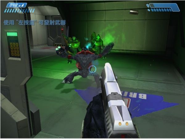 眼形機(jī)器人會(huì)散發(fā)出醒目的藍(lán)色光芒,在較遠(yuǎn)也能望到不容易跟丟。在開(kāi)始(A)身上裝備攻擊來(lái)復(fù)槍和手槍,關(guān)卡中有多樣的武器可以拾到,在開(kāi)始攻擊復(fù)槍已足夠應(yīng)付。跟隨眼形機(jī)器人往前走,在庭院里會(huì)遇到一群小怪物沖過(guò)來(lái),注意集中火力射爆大頭怪,它會(huì)象炸彈一樣爆掉,化為幾只小怪物,附近的怪物也化為碎片,威力著實(shí)不小,在戰(zhàn)斗中與此類怪物保持距離,在近身之前將之引爆。接下來(lái)會(huì)出現(xiàn)手執(zhí)槍械的怪物,往開(kāi)始的位置且戰(zhàn)且退,清除后眼形機(jī)器人說(shuō):“We are near the index chamer, follow me!”,跟著它穿出一條通道(,在這個(gè)庭院里怪物會(huì)從上方的四根管道跳出來(lái),這時(shí)最好退到通道里集中火力,不至于被蜂涌的怪物圍攻,清除后一批后再引另一群同樣消滅。