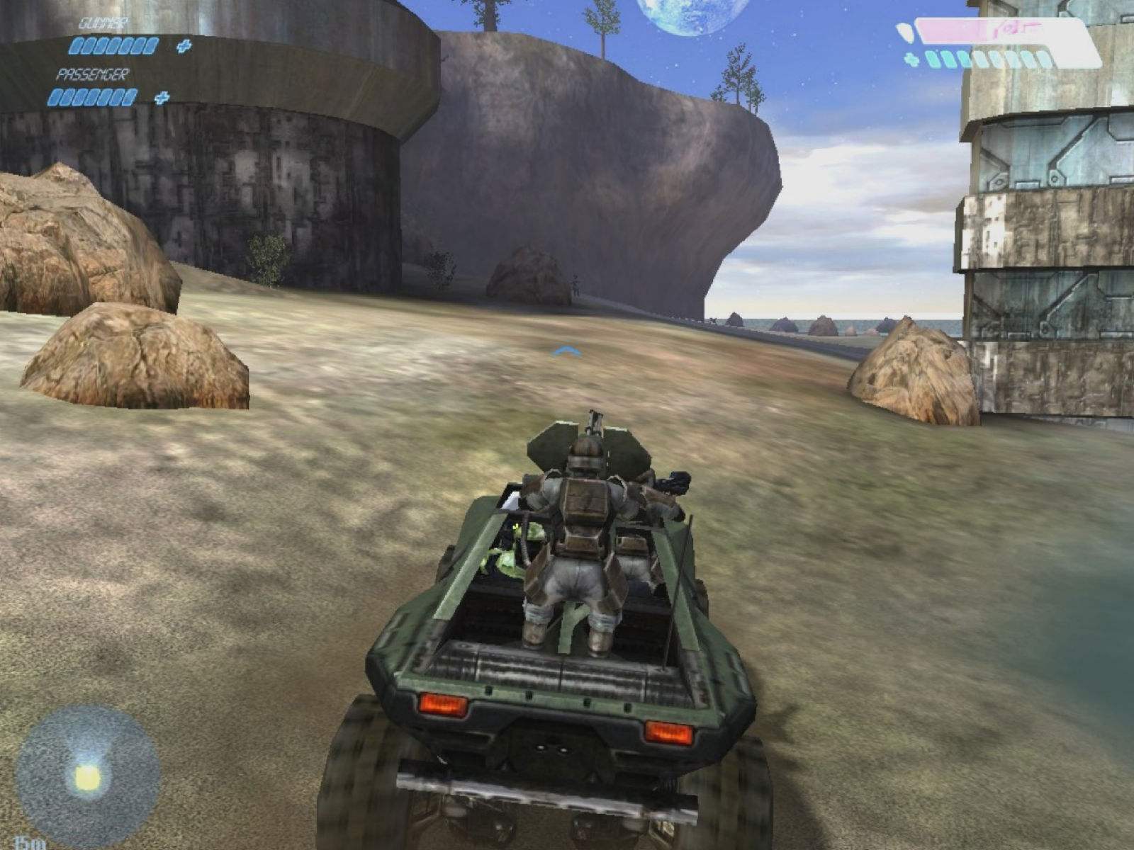 將敵人消滅后收到訊息,一輛我方的運(yùn)輸艦送來(lái)一輛武裝吉普車(Warthog),按E鍵進(jìn)入車輛,里面有一名機(jī)槍手,先熟悉一下操作。Cortana提及另外生存的隊(duì)友,沿著運(yùn)輸艦飛離的方向往石谷下面駛?cè)?,在盡頭找到隧道入口,在隧道里有一處橫塹的地方要保持車速?zèng)_過(guò)去,不要讓車輛損壞或機(jī)槍手受到傷亡,穿出隧道眼前豁然開(kāi)朗,在柱子鐵箱后面埋伏著大批敵人,這里要迅速?zèng)_到任一側(cè)跳下吉普車,消滅柱子之間的敵人,這樣機(jī)槍手才會(huì)存活下來(lái),他會(huì)自動(dòng)掃射出現(xiàn)的目標(biāo)。將兩側(cè)平臺(tái)的敵人殺光后,到前方發(fā)現(xiàn)斷橋,由右側(cè)的斜坡上去找控制臺(tái),使用開(kāi)關(guān)接通橋梁,回去乘上吉普車穿過(guò)橋梁和七轉(zhuǎn)八彎的隧道進(jìn)入一道峽谷。
