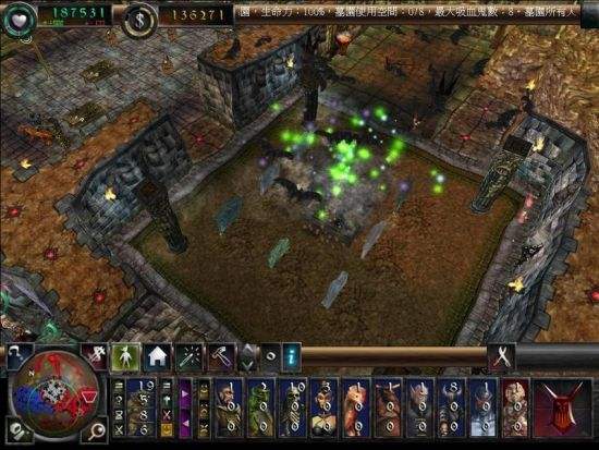 剛開(kāi)始我方所有能戰(zhàn)斗的兵都關(guān)在敵人監(jiān)獄里,派小鬼先在心臟右側(cè)挖一個(gè)缺口,然后一直向右鋪路到底,把最右面的門(mén)砸了,砸開(kāi)后還能看見(jiàn)一扇門(mén),也要砸開(kāi),就能看到被關(guān)著的怪了。如果有敵人鐮刀魔干擾不用理它,只要小鬼跑到監(jiān)獄附近就能把兵救出來(lái),然后就能搞定鐮刀魔。占來(lái)的監(jiān)獄沒(méi)什么用,就放在那好了。等所有兵都救出后,先把心臟上方的門(mén)砸開(kāi),里面是個(gè)養(yǎng)雞場(chǎng),搞定里面的敵人。然后再砸養(yǎng)雞場(chǎng)上方和左方的門(mén),都是巢穴,并且有敵人駐守。砸門(mén)前先存?zhèn)€盤(pán),你的骷髏和鐮刀魔死了不要緊,其它的千萬(wàn)不要死。等穩(wěn)定下來(lái)后繼續(xù)攻占其它的建筑,可以得到寺廟、儲(chǔ)金室、圖書(shū)館和工廠。如果骷髏沒(méi)死的話,會(huì)和胖子發(fā)生內(nèi)戰(zhàn),所以還是讓他們送死好了。鐮刀魔沒(méi)死的話,倒可以讓他去廟里轉(zhuǎn)圈。