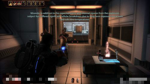 殺完后照例搜刮一下?;仡^去接下來的電腦室,這里有臺電腦可以得到點神秘美妞Miranda的資料,她是Shepard重生計劃的主要科學家成員之一。*這里提一下,我覺得ME2里面對話選項的多少是根據(jù)Shepard本身獲得資訊的多少決定的,所以不閑麻煩的應該多對話和收集信息。*此處房間地上有個datapad,hack后可以搞點錢。搜刮完后去甲板區(qū)域的另一端。