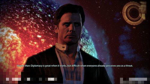 直到你面見I-Man,Shepard才發(fā)現(xiàn)這個神秘人并不在船上,他通過全息投影,在某個不知名的地方和你對話。對話的選項挺多,照舊挖掘點內容。記得善惡的選項影響,以后不多作提示了。I-Man很開門見山的表明自己的立場,確保人類的生存是他的終極目標,但這個目標正被某種勢力威脅著。他堅信Shepard是唯一能抵抗這股神秘勢力的人物,所以才不惜一切復活你。行動的第一站是星盟的總部Freedom's Progress,哪里正被敵人包圍著。自此質量效應的世界正式開啟。