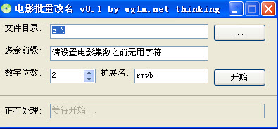 電影批量改名工具是一款電影文件批量改名軟件,為了做懶人,改電影名字時快點,運行后選擇電影所在的目錄,然后設(shè)置“多余前綴”,然后選擇數(shù)字位數(shù),然后填寫后綴名,點開始即可!!