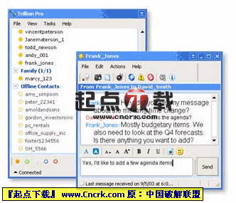Trillian v4.0 Alpha Build 49 英文共享版 一個(gè)功能非常強(qiáng)大的網(wǎng)絡(luò)即時(shí)聯(lián)絡(luò)工具,包括:支持IRC、AIM、ICQ、MSN Messenger。它的其他功能包括:多服務(wù)器連接;可定制的圖形界面;加密DCC聊天;普通和加密DCC聊天室。它具有獨(dú)特的非直線型的窗口和可更換皮膚的界面(通過XML)。Trillian 還具有常用的好友列表、聲音支持、透明窗口等。而且它使用起來非常清爽,沒有廣告和煩人的窗口,并且支持有腳本語言。