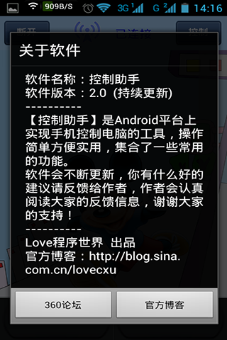 控制助手是Android(安卓)平臺(tái)上實(shí)現(xiàn)手機(jī)控制電腦的工具,操作簡單實(shí)用方便,集合了一些常用的功能,通過控制助手你就可以實(shí)現(xiàn)手機(jī)控制電腦、有了它你可以控制自己的電腦關(guān)機(jī)、待機(jī)、重啟、鎖定電腦屏幕、鎖定鼠標(biāo)鍵盤、關(guān)閉顯示器、傳送文字、控制電腦鼠標(biāo)、運(yùn)行CMD命令、等操作。