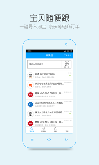 快遞查詢:輸入快遞單號或掃描條形碼即可查詢快件跟蹤及簽收狀態(tài),支持國內(nèi)數(shù)十家快遞品牌如:申通、EMS、順豐、圓通、中通、韻達、天天、匯通、宅急送等;