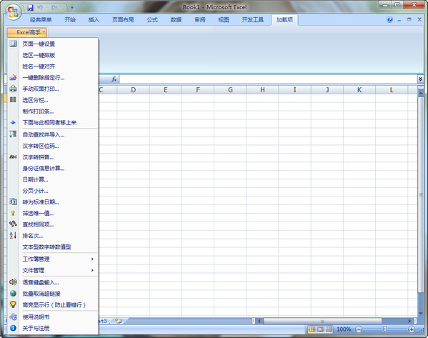3、安裝完成以后,每次啟動Excel時,都會自動啟動“Excel高手”,它將出現(xiàn)在Excel菜單欄的最后。若是Excel2007,它將出現(xiàn)在“加載項”里面。