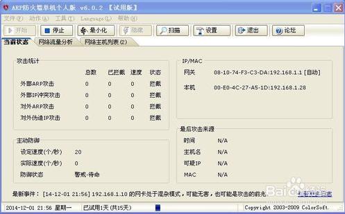 彩影ARP防火墻可以自動(dòng)檢測(cè)攔截由病毒引起的本機(jī)對(duì)外的ARP攻擊,攔截到攻擊后,選擇“安全事件”選項(xiàng)卡,查看詳細(xì)的攻擊數(shù)據(jù)信息,可看到病毒攻擊的時(shí)間與病毒進(jìn)程名。