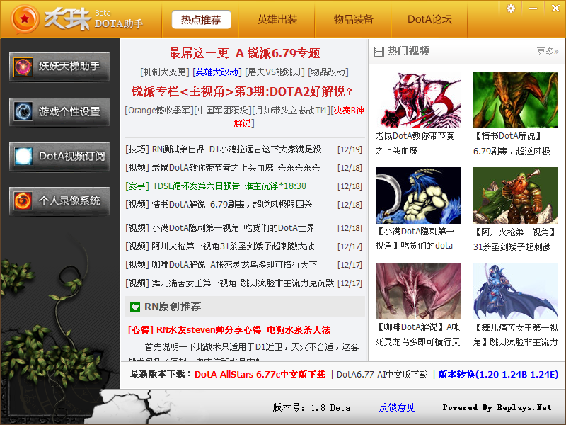 DOTA龍珠助手是魔獸爭霸3冰封王座DOTA地圖的輔助工具,它可一直接查詢11天梯積分排行,并可設(shè)置BKB、大招等冷卻時間提醒、封野視野范圍提示等功能,還有海量DOTA視頻解說高清觀看。