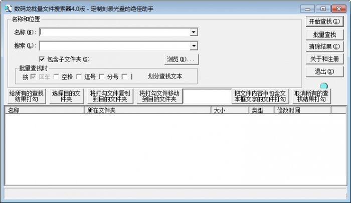 《數(shù)碼龍批量文件搜索器》可以把文件名列表里的文件批量搜索出來,然后你可以有選擇的將這些搜索結(jié)果統(tǒng)一拷貝或移動到某一指定文件夾里。
