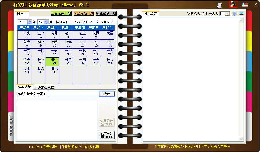 2、可設置密碼來保護數(shù)據(jù)庫,不知道密碼的人無法看到備忘內容,無法操作數(shù)據(jù)庫。只能把本軟件當個桌面日歷看看。(個人感覺這個功能其實挺好的,就算知道密碼,有時不輸入用來看看日歷也不錯?。?br />3、能夠對備忘內容進行模糊搜索,點擊搜索結果,可以實時轉到那天,方便查看。