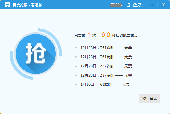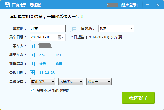 百度衛(wèi)士搶票版是最快的搶票神器,用戶只需設(shè)定好火車票的相應(yīng)信息,百度衛(wèi)士就會在瞬間檢測出是否有符合條件的車票,自動進行反復(fù)搶票,甚至連以往用戶必須手動填寫的驗證碼也由機器智能輸入。系統(tǒng)搶票成功后,會直接引領(lǐng)用戶進入12306支付頁面,無需二次登陸,快速完成付款流程。由于百度衛(wèi)士搶票版采用極速加載技術(shù),精簡了大量用戶正常訪問12306時加載的不必要的網(wǎng)頁元素,真正從內(nèi)核上優(yōu)化網(wǎng)絡(luò)訪問速度,使搶票時間遠遠低于瀏覽器和插件類產(chǎn)品,大大地提高了訂票的成功率。