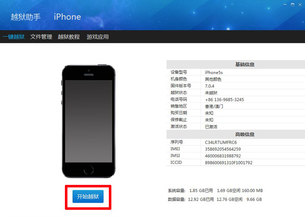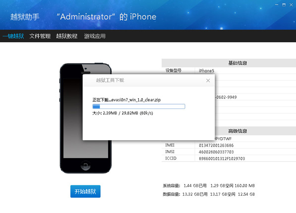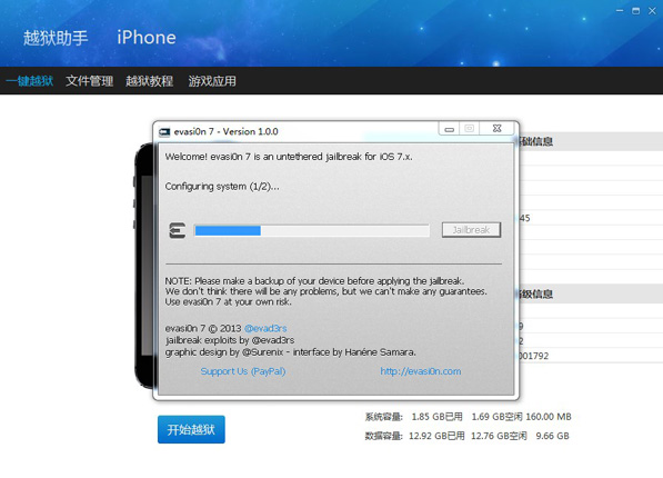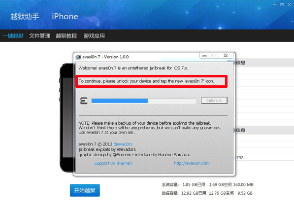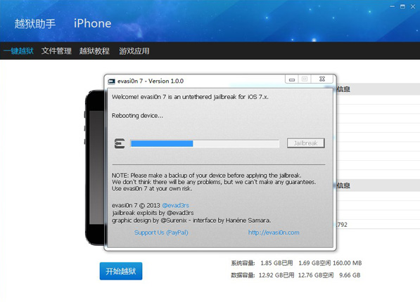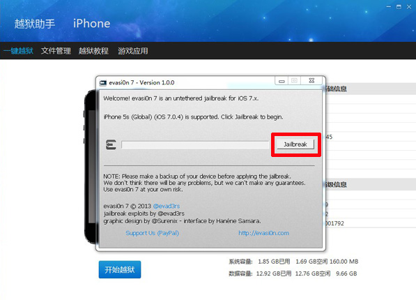 第一步:將設(shè)備連接上電腦,識(shí)別成功后。點(diǎn)擊【Jaibreak】,【evasi0n】工具運(yùn)行