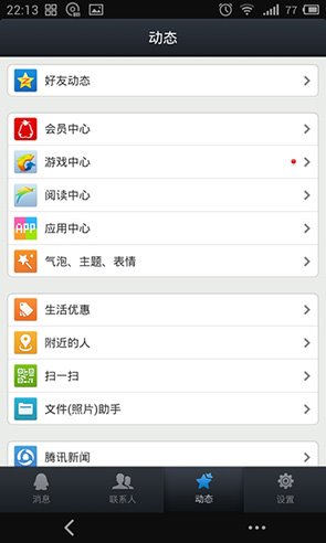 在正式版中手機QQ包含四個底欄按鈕,分別是消息、聯(lián)系人、動態(tài)和設(shè)置,而在低配版中手機QQ被縮減為了三個,取消了動態(tài)這一功能,喜歡在QQ里查看空間動態(tài)的用戶看來是用不了了。游戲中心和應(yīng)用中心什么的也砍掉了,這樣一下子就能瘦身不少。