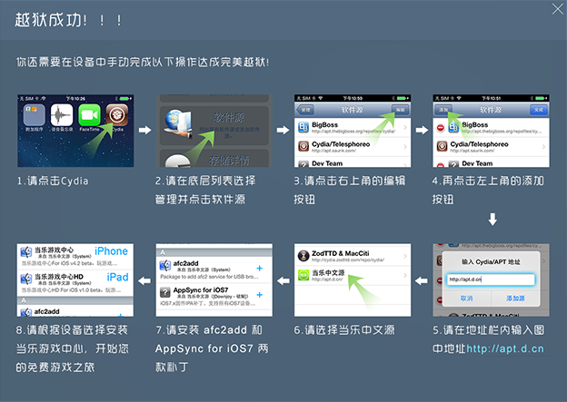 第三步:設(shè)備重啟之后,當(dāng)樂越獄助手會(huì)提醒你已經(jīng)越獄成功,如下圖。