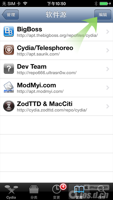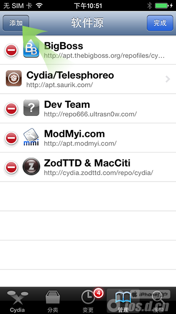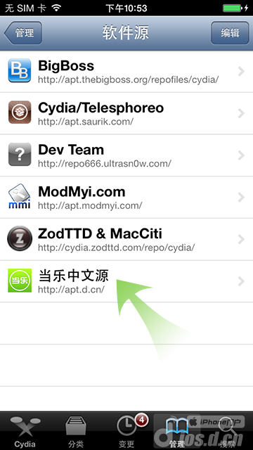 4.Cydia會(huì)自動(dòng)加載數(shù)據(jù),等待加載完成后依次點(diǎn)擊”管理“——”軟件源“——”編輯“——”添加“——輸入源地址”http://apt.d.cn“——”添加源“