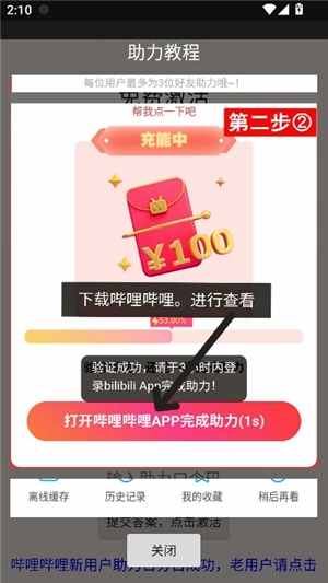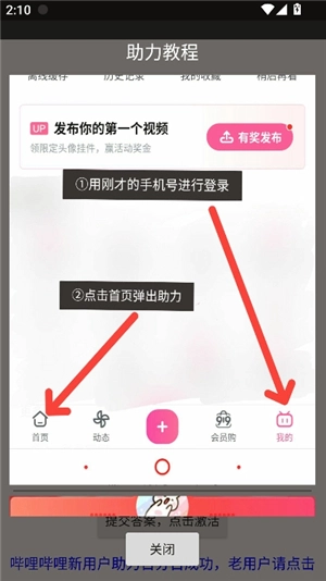 6、用手機(jī)號(hào)登錄b站,接著點(diǎn)擊首頁(yè)彈出助力