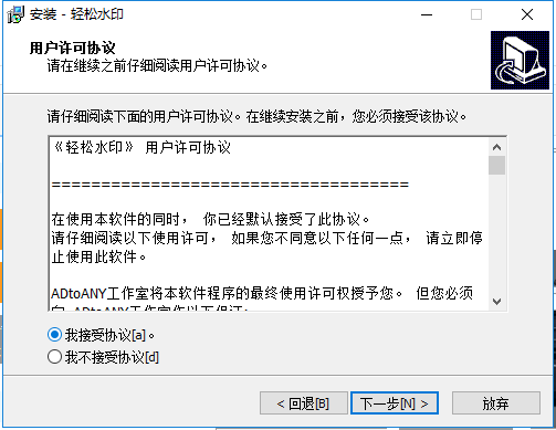 2、進入用戶許可協(xié)議界面中,你可以先閱讀輕松水印用戶許可協(xié)議,您可以滾動進度條翻頁,閱讀完后,如果您沒有異議。請點擊“我接受協(xié)議”,選擇完成后點擊【下一步】。