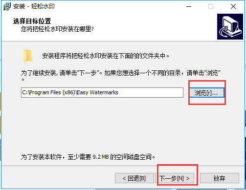 3、選擇輕松水印扥安裝位置,您可以直接點擊【下一步】軟件會默認安裝到C盤中,或者您可以點擊【瀏覽】按鈕,然后會彈出一個新的界面,您可以選擇輕松水印破解版安裝位置再點擊【確定】,選擇完成后點擊【下一步】。
