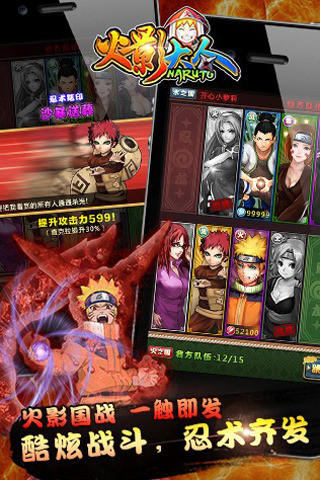 《火影大人》是一款以著名動(dòng)漫《火影忍者》為故事背景的手機(jī)卡牌策略游戲,游戲中引入多種忍者角色,并在玩法上進(jìn)行了重大創(chuàng)新,游戲中不僅有歷練升級(jí)、闖關(guān)奪寶、競(jìng)技挑戰(zhàn)等常規(guī)玩法,更是首創(chuàng)獨(dú)具特色的國(guó)戰(zhàn)系統(tǒng)。玩家在進(jìn)入游戲之初便要選擇火、水、雷、風(fēng)、土任一國(guó)家,每晚19:30全服開(kāi)啟國(guó)戰(zhàn),各國(guó)精英齊聚一堂抗擊敵人,體會(huì)萬(wàn)人國(guó)戰(zhàn)千人斬的爽快感覺(jué)!每場(chǎng)國(guó)戰(zhàn)力挽狂瀾的英雄將受萬(wàn)眾敬仰,圓玩家英雄夢(mèng)想!每位志存高遠(yuǎn)的玩家也可以通過(guò)實(shí)力競(jìng)爭(zhēng)國(guó)家官員乃至影者(國(guó)王),走向至尊!【更新日志】
