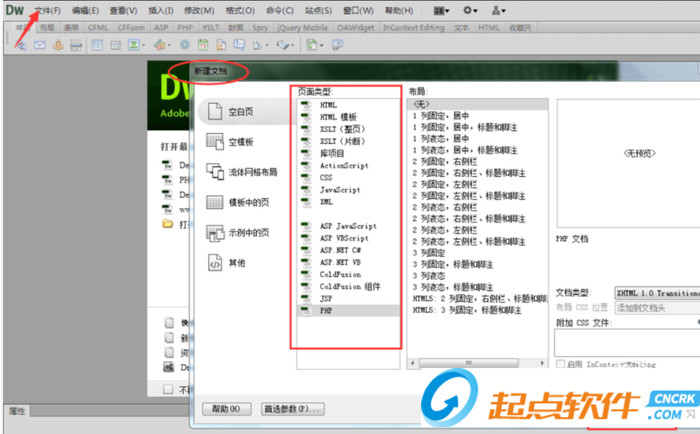 1、在網(wǎng)頁三劍客正式版點(diǎn)擊菜單欄目的文件---選擇新建---會(huì)彈出新建文檔,里面有很多的頁面類型,可以選擇需要的,然后點(diǎn)擊--建立即可。