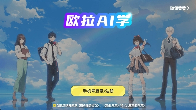 1、在本站下載安裝歐拉AI學(xué)并打開,此時(shí)界面提示使用手機(jī)號(hào)登錄,大家可先點(diǎn)擊右上角“隨便看看”進(jìn)入。