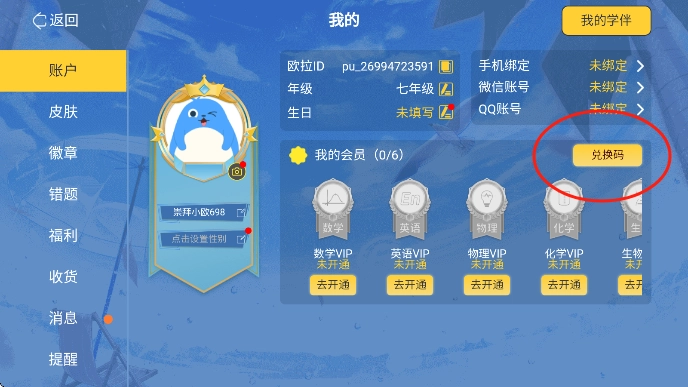 3、在【可兌換歐拉初中數(shù)學(xué)vip】處輸入兌換碼,點(diǎn)擊確定即可完成VIP兌換。