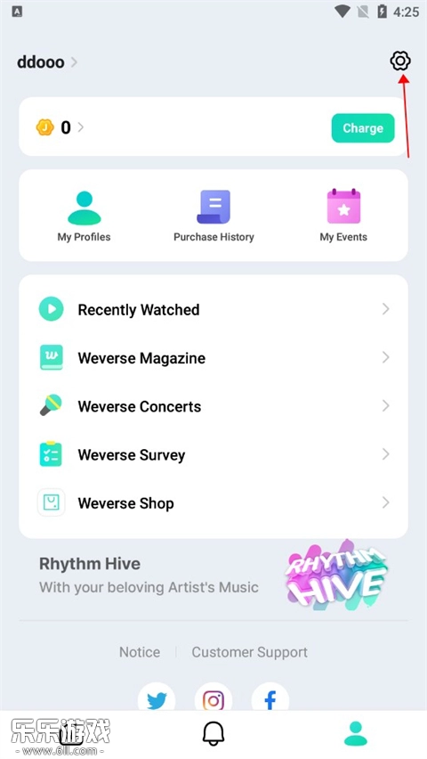 1、開啟6ll的weverse軟件。輕點右下角“我的”,接著點擊右上角的設置