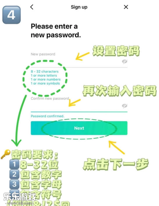 4. 設置密碼并再次確認(請注意密碼要求)Next