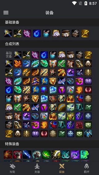 4、給出裝備清單、合成路線以及屬性闡釋,并且對每個英雄的技能與屬性展開詳細介紹。