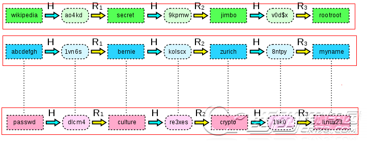 H(wikiedia)=ao4kd -> R1(ao4kd)=secret -> H(secret)=9kpmw -> R2(9kpmw)=jimbo -> H(jimbo)=v0d$x -> R3(v0d$x)=rootroot H(abcdefgh)=1vn6s-> R1(1vn6s)=bernie-> H(bernie)=kolscx-> R2(kolscx)=zurich-> H(zurich)=8ntpy -> R3(8ntpy)=myname .... H(passwd)=dlcm4-> R1(dlcm4)=culture-> H(culture)=re3xes-> R2(re3xes)=crypto-> H(crypto)=1tik0-> R3(1tik0)=linux23