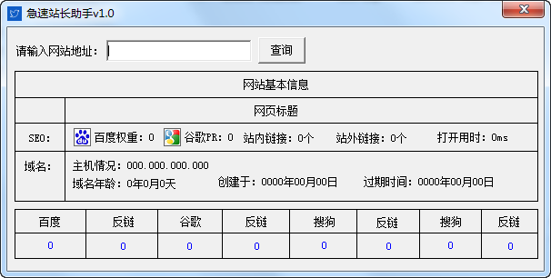 急速站長助手是一款適合站長使用的網(wǎng)站綜合查詢工具,急速站長助手可以查詢網(wǎng)站的PR值、百度權(quán)重、內(nèi)鏈外鏈數(shù)量等情況,讓站長對網(wǎng)站有一個清晰直觀的了解。