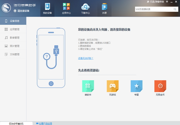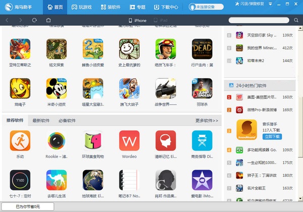 1、海馬助手直觀清晰的界面海馬助手主界面包括:付費(fèi)應(yīng)用免費(fèi)裝、國(guó)外應(yīng)用、海馬學(xué)堂、無線金幣專題列表、功能導(dǎo)航等,設(shè)計(jì)簡(jiǎn)潔明了,界面清新,給人春風(fēng)拂面之感!