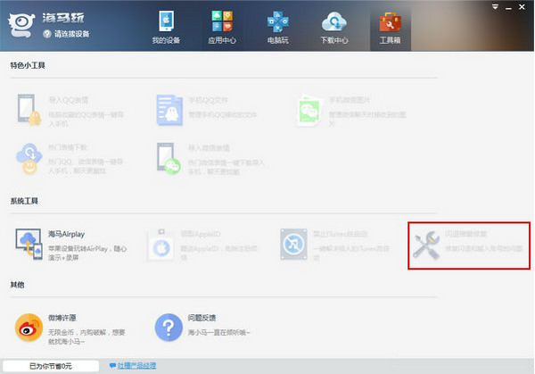 進(jìn)入海馬蘋果助手,點(diǎn)擊工具箱那塊功能中的閃退修復(fù)工具即可快速修復(fù)。