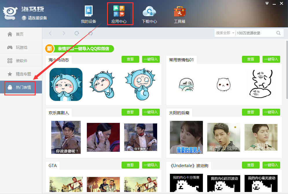 表情包導(dǎo)入到手機(jī)方法將手機(jī)連接電腦,點(diǎn)擊【應(yīng)用中心】,在左側(cè)欄選擇【熱門表情】,就可以在頁面中選擇喜歡的表情導(dǎo)入到QQ或微信啦。