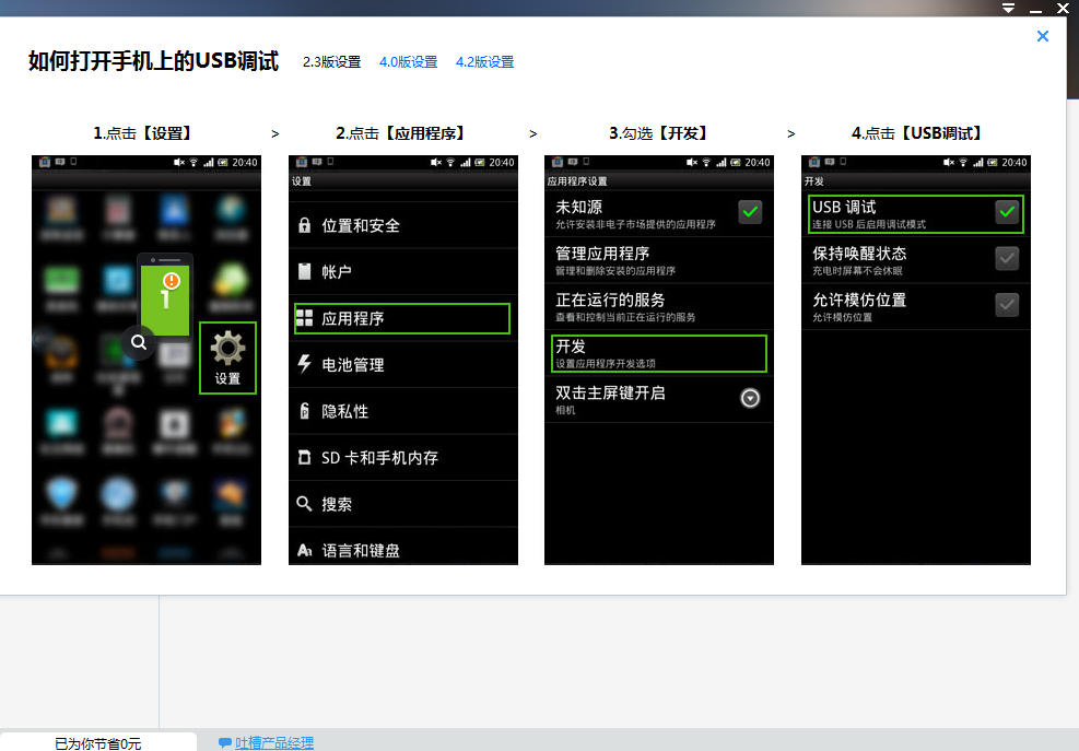 3、 檢查您是否有開啟了【USB調(diào)試】功能,如果您對(duì)開啟方法不清楚也不要著急,請(qǐng)參考下圖。