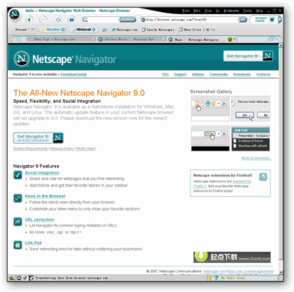 Netscape 是為滿足您在互聯(lián)網(wǎng)上的各種需求所設(shè)計(jì)的 - 瀏覽網(wǎng)頁,搜索信息,通信,購物,下載及欣賞音樂等應(yīng)有盡有。它包含一個(gè)威力無比的電子郵件工具,以及全球首屈一指的即時(shí)信息服務(wù),即“AOL 快信信使”(AIM)。它還能為您提供更大的空間,以充分發(fā)揮您在網(wǎng)上的各種經(jīng)驗(yàn)與技能。 Netscape 7.2版本所具有的新特性包括: 改進(jìn)的彈出式窗口屏蔽控制 新的 Macromedia Flash 7 插件 密碼管理器 改進(jìn)的 Palm 同步 改進(jìn)的瀏覽器渲染速度和應(yīng)用程序啟動