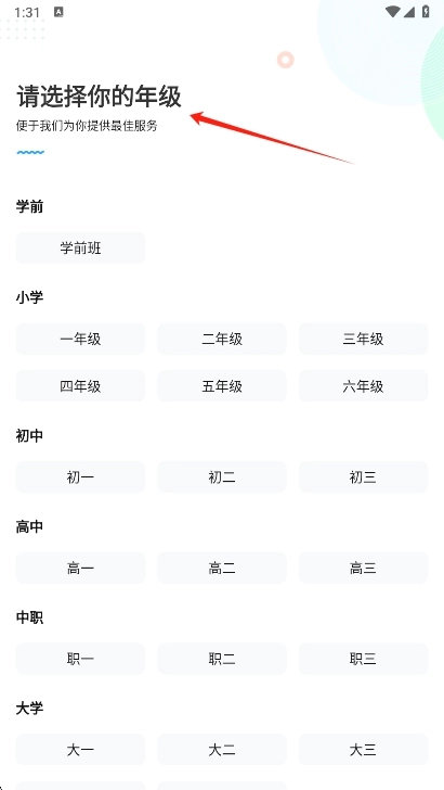 2、進(jìn)入之后,開始進(jìn)行年級選擇,您只需依據(jù)自己要學(xué)習(xí)的年級來選擇即可。