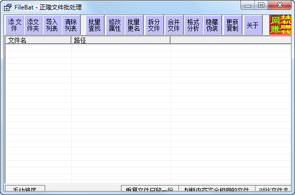 正隆文件批量處理是一款小巧實(shí)用的文件批量處理器,可以執(zhí)行文件批量更名、文件合并、屬性修改等多種功能,執(zhí)行速度快,不占用內(nèi)存空間,是文件批量處理的首選工具。