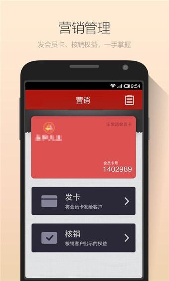 1、新增“營銷”欄目,為商家提供會員卡發(fā)放和權益核銷的功能。