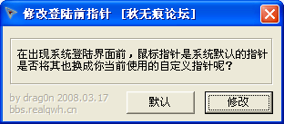 【概括介紹】修改登陸前指針小巧方便的鼠標(biāo)指針修改器。軟件操作簡單,只需按下修改就會自動(dòng)替換掉系統(tǒng)默認(rèn)的指針,有多款指針供您選擇,歡迎下載使用。