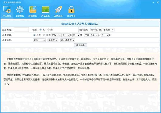百歲老爺爺起名軟件是一款根據(jù)您的出生時(shí)辰量身定制,這款起名軟件基于姓名學(xué)三才五格生肖喜忌音形意等多方面綜合考慮,從浩瀚的漢字組合中篩選出所有五行、五格和寓意都沒(méi)有缺陷的名字。