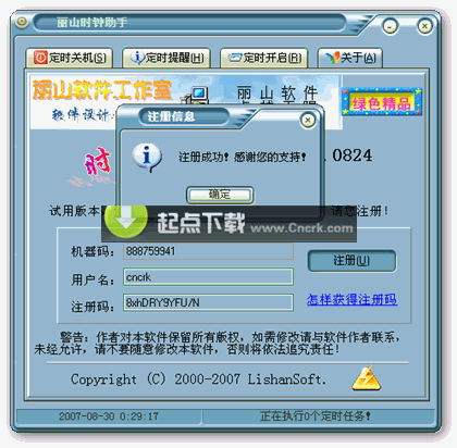 麗山時(shí)鐘助手 2007.0824 綠色免費(fèi)版 麗山時(shí)鐘助手 純綠色軟件,無(wú)任何插件。幫助您進(jìn)行定時(shí)任務(wù)的提醒和執(zhí)行,有倒計(jì)時(shí)設(shè)定和定時(shí)設(shè)定兩種計(jì)時(shí)方式,可同時(shí)進(jìn)行多個(gè)任務(wù)的定時(shí)設(shè)定,可自定義執(zhí)行前的提醒時(shí)間和內(nèi)容,會(huì)以氣泡或聲音提醒方式進(jìn)行提醒